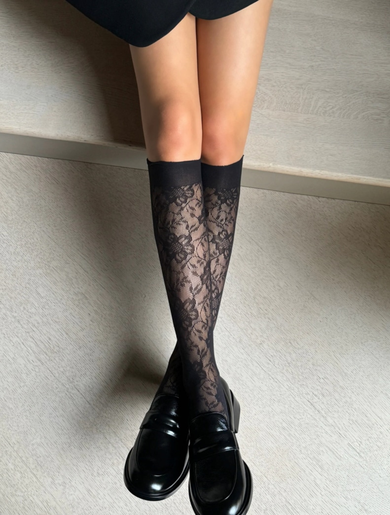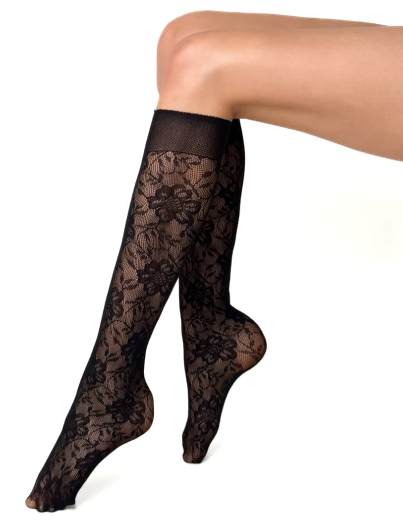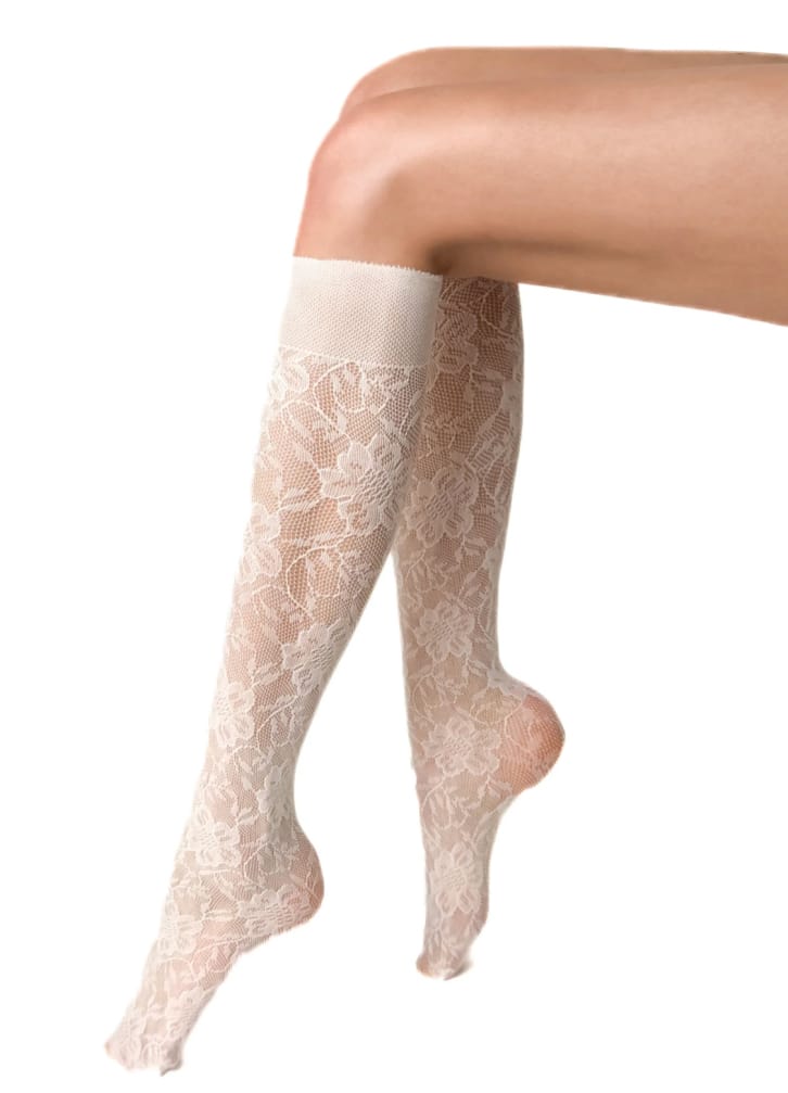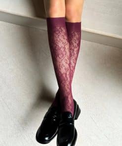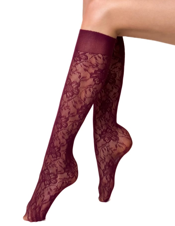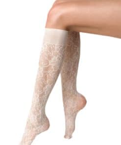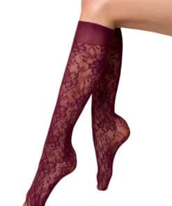 Smarte knæstrømper fra Veneziana. Strømperne har et elegant blomstermønster indvævet og føres i sort, råhvid eller bordeaux i onesize.