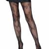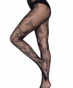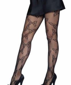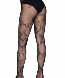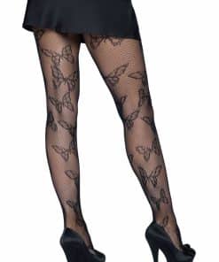 Sorte hulmønstrede strømpebukser fra Leg Avenue. I blød mat kvalitet med indvævede sommerfugle. Forstærket tå. Str. S, M, L.