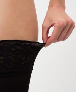 Matsorte selvsiddende strømper i 100 denier fra Giulia. Strømperne er i en ikke transparent kraftig 100 denier. Med bred blondekant med silikone. Forstærket usynlig tå.
