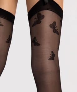 Forsiden af sorte nylonstrømper til hofteholder med mønster af sorte sommerfugle på lårene.