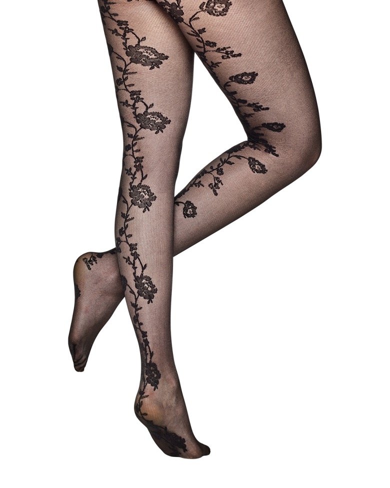 Virkelig smukke og udtryksfulde sorte strømpebukser med indvævet blomstermønsterfra Vogue.