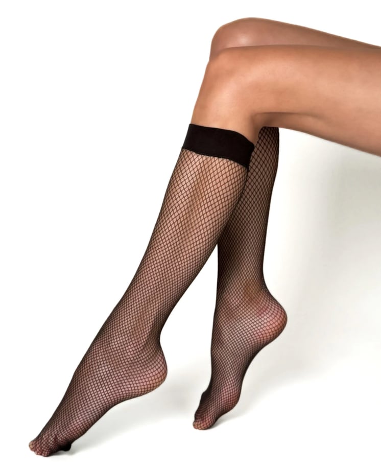 Knæstrømper i mikromasket net fra Veneziana. Med bred elastisk kant for optimal hold. Føres i sort, beige, marineblå, pink og mørk brun i onesize. Forstærket usynlig tå. NYE FARVER!
