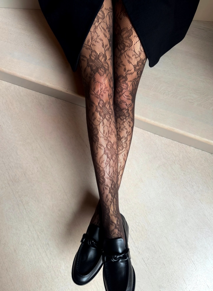 Elegante strømpebukser med mønster fra Veneziana. Strømpebukserne er brune og har et smukt indvævet blomstermønster. I mat 30 denier. Forstærket usynlig tå.